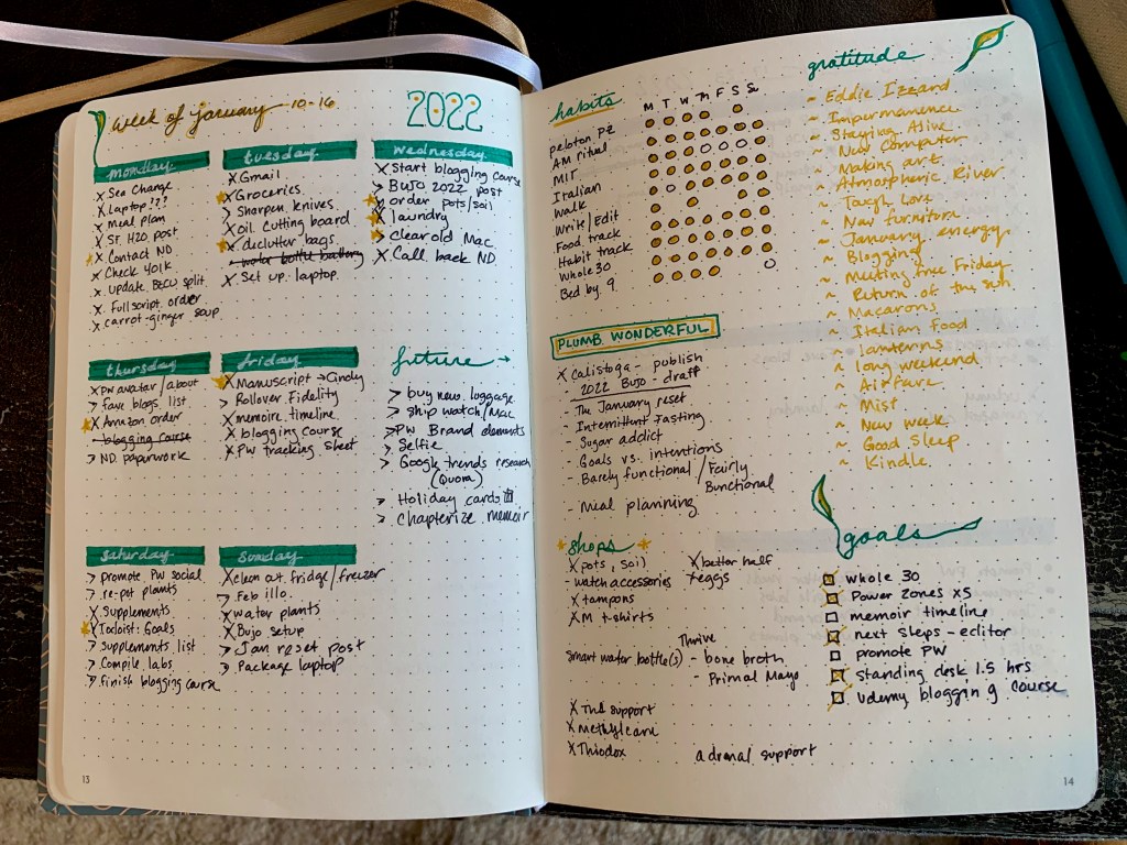 In the past, I have added some weekly stats for things like daily steps and GKI (when I was on the Keto diet). I’ve sometimes created a section for “notes” but rarely wrote anything in it. I’ve now started adding items to a shopping list as I think of them and consolidate my shopping into a weekly splurge rather than randomly ordering things whenever I think of them. This includes items for the grocery list and supplements that are running low.