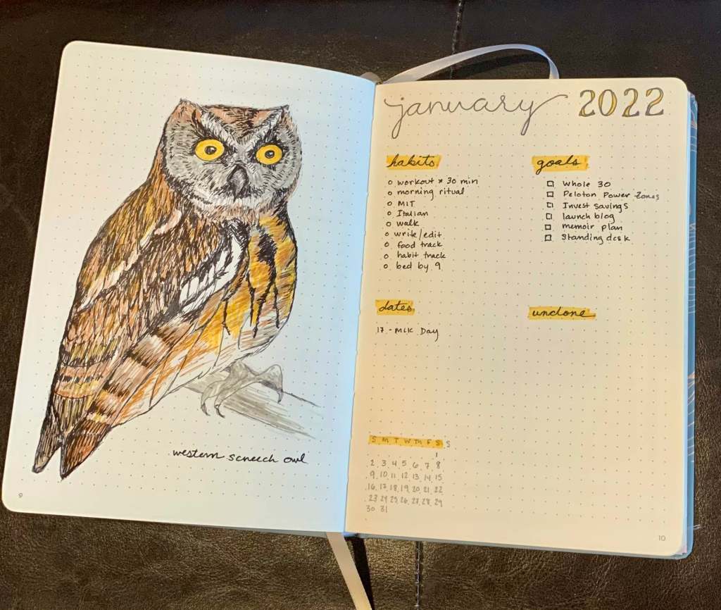 I try to keep my Bullet Journal practices fairly simple. I don’t go for elaborate decorations, and my hand lettering is fairly quick and sloppy when I try it. I don’t have a lot of time to spend on elaborate spreads and artwork. But this year I decided to add an artistic element. I’ve wanted to get more visual art back into my life, so I am drawing a bird of the month as part of my monthly spread.